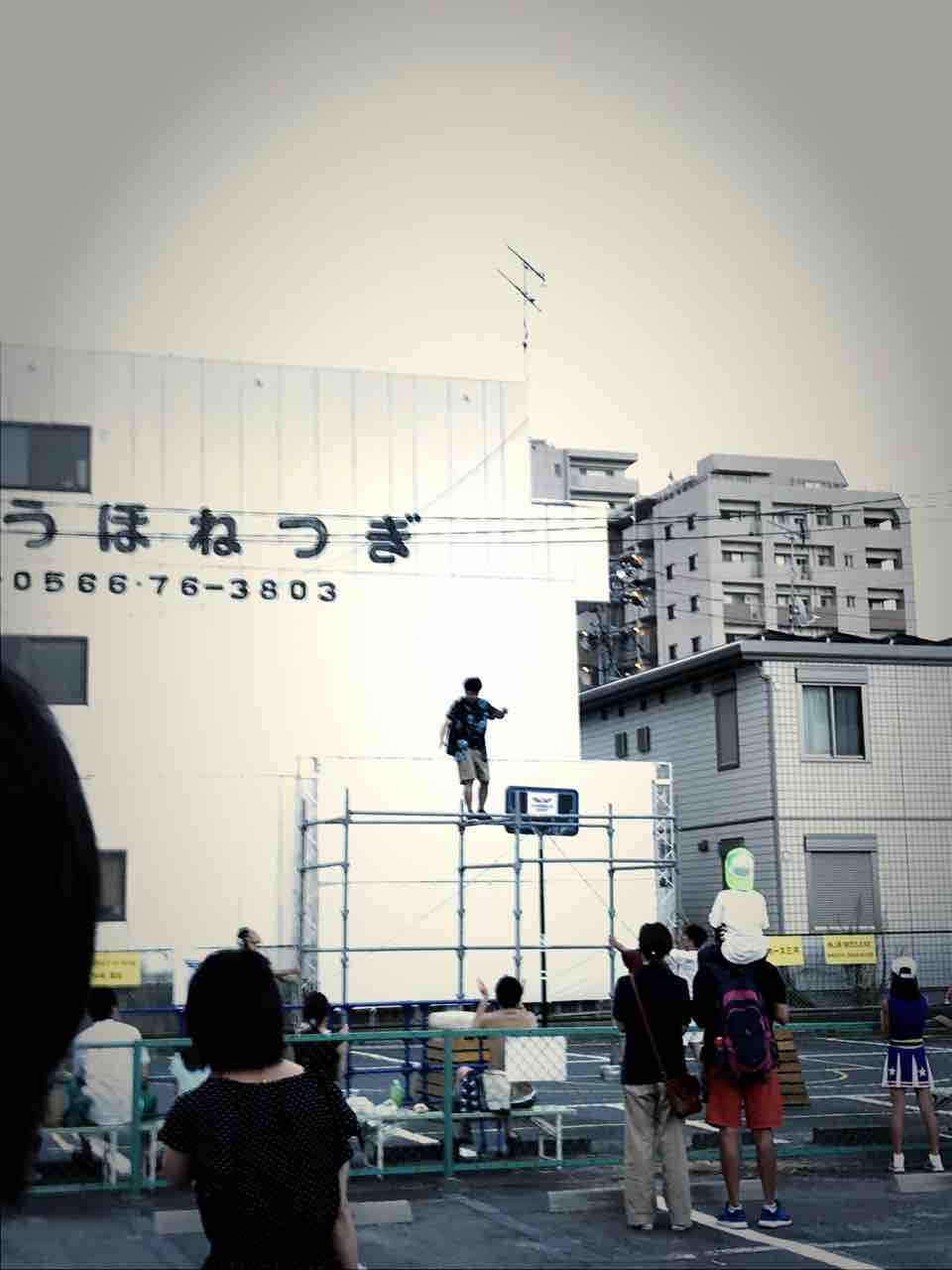お祭りで飲み過ぎて酔っ払い微妙な高さから自決を試みる男性の図、ではなく、高所で演技するパフォーマーの方。