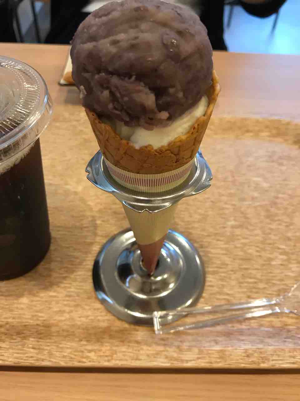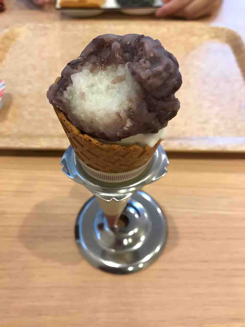 ワッフルコーンのアイスの上につぶあんのおはぎ。