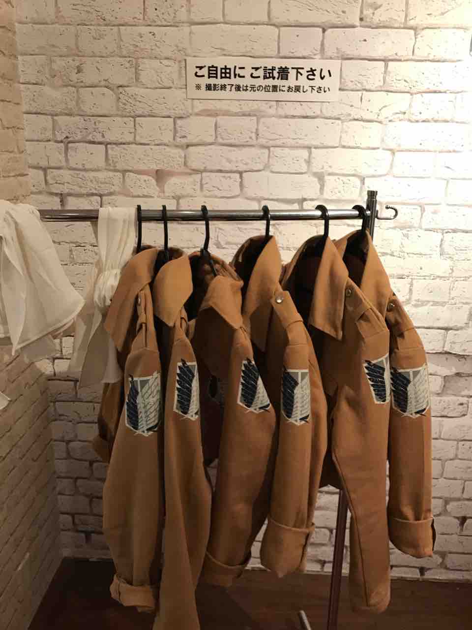 入るとすぐ、調査兵団のジャケットを試着出来るコーナーがあります。もちろん試着してリヴァイ兵長になりきる。