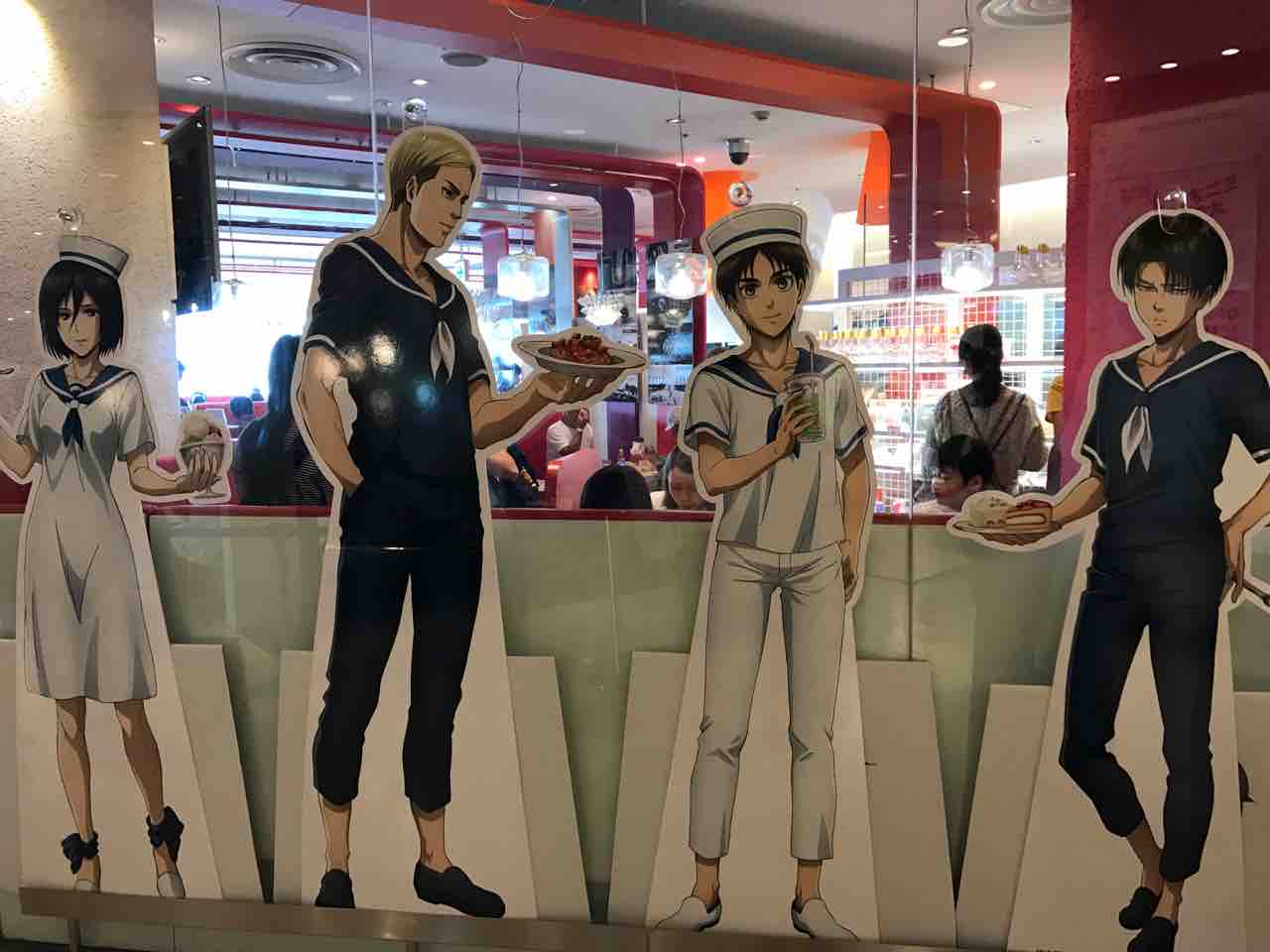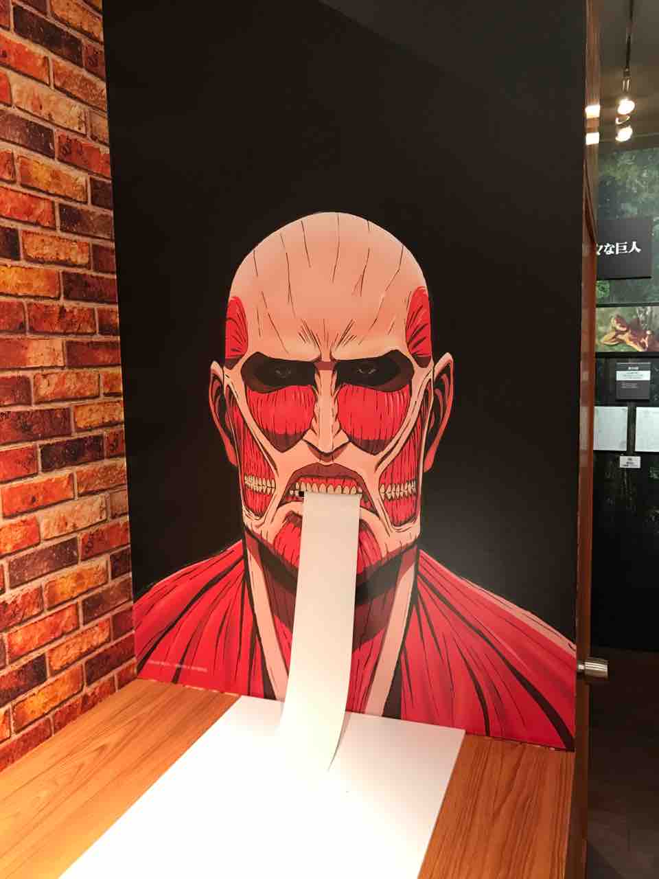 店内のモニターでは進撃の映像が流れ、壁はこんな感じで進撃尽くしです。