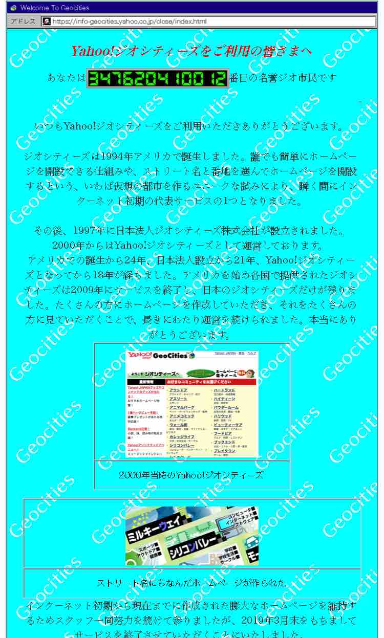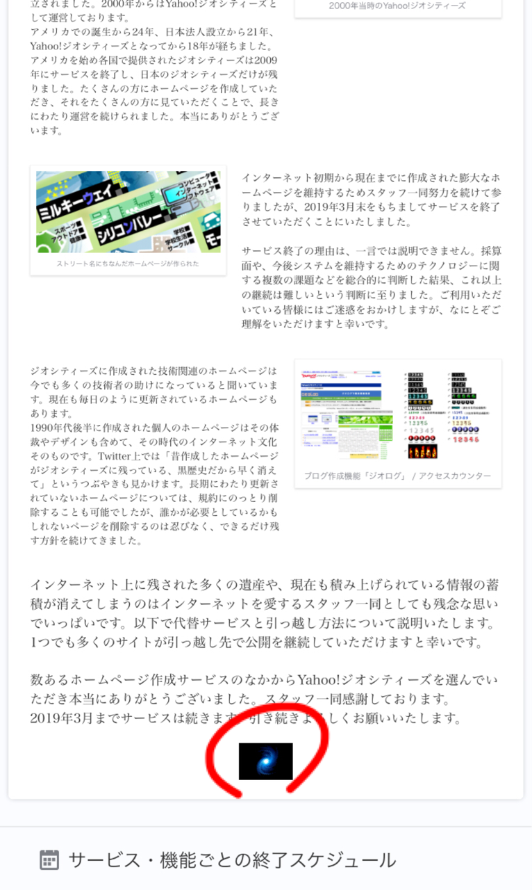 私も遥か昔に廃墟系ホームページを作成しようとしてジオシティーズに登録していたので、私のもとにもサービス終了のお知らせメールが届いたのですが、その時は「終わっちゃうのかー」くらいにしか思わなくて。